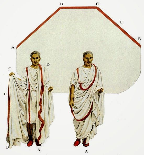 Egy átlagos férfi felöltöztetéséhez egy 4,7m hosszú és 2,3 m széles ovális textildarab szükséges, aminek a 'felső része' egy kicsit szögletesebb, mint az alsó (mármint az a rész, ami a feje felé lesz). Kisebbeknek kevesebb, lucullusi idomúaknak több vászon szükségeltetett. Hiszen a toga nem egy halom rongy, hanem a redők mesteri elrendezésének művészete, tehát a toga egyik fő szempontja, hogy pont a megfelelő anyagmennyiség álljon (lógjon) rendelkezésre, amit lehet redőzni. A túl kevés snassz, a túl sok meg nevetséges. Tudták ezt jól a régiek.